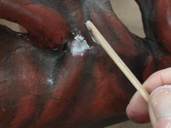 First I stabilised the crack with a rabbit skin glue mix. I then filled the cracks using traditionasl gesso.